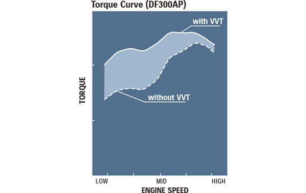 Suzuki's engineers designed the 4.0-liter V6 engine with an aggressive cam profile that delivers maximum output and performance at high rpm. In coupling this cam profile with Suzuki's advanced Variable Valve Timing (VVT), the DF300AP/250AP delivers the additional torque that outboards need for accelerating in the low to mid-range. VVT achieves this by adjusting the timing of the intake valves, allowing them to open before the exhaust valves are fully closed, creating a momentary overlap in the timing where both sets of valves are open. Using VVT, this overlap can be increased or decreased by altering intake timing with the camshaft resulting in optimum timing for low and mid-range operation.