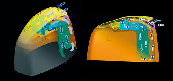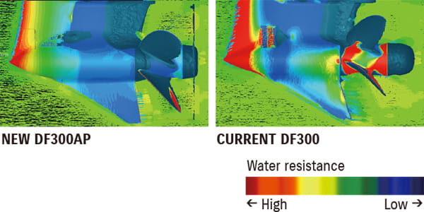 The case itself is actually larger than the previous model to provide increased gear durability, however it is designed with a smoother, more hydrodynamic shape that allows it to move through the water with less drag and greater efficiency. Areas with the highest drag are indicated in red in the illustrations below. The comparison shows that the new design allows the lower unit to slice through the water with less drag.