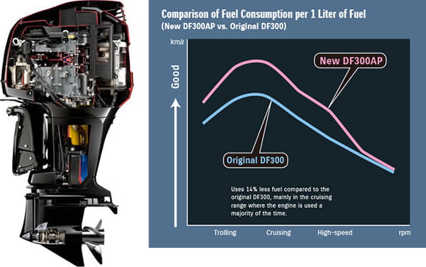 Suzuki's innovative Lean Burn Control System was first introduced on the DF90A/80A/70A to great acclaim from boaters and the media alike. It predicts fuel needs according to operating conditions allowing the engine to run on a more efficient fuel mixture through the use of a lean air-fuel ratio. It delivers its benefits over a wide operating range, providing significant improvements in fuel economy from low-speed operation into the cruising range. Combining this system with the Suzuki Precision Control electronic throttle and shift system allows the operator precise control over engine RPM for improved fuel economy over a wider operating range. This combination also delivers smooth power transitions throughout the entire RPM range. In-house testing shows that while cruising, the DF300AP is 14% more economical than the original non-Lean Burn DF300 without sacrificing any power of the original DF300.